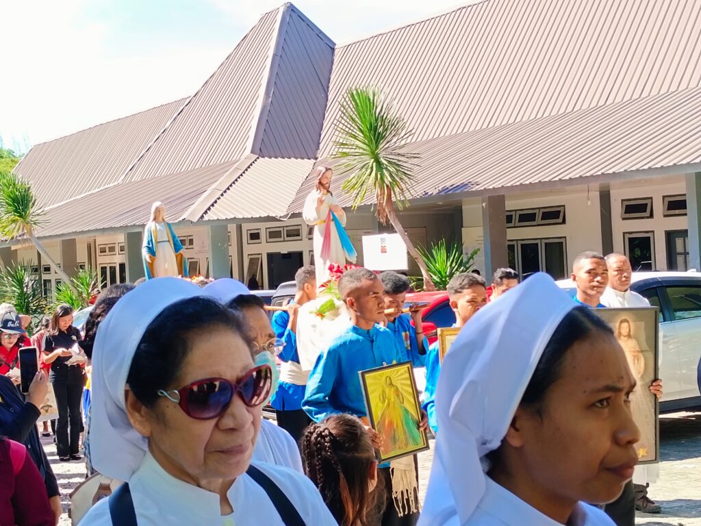 Umat mulai berdatangan sejak pukul 12.00 siang, memadati pelataran taman ziarah untuk mengikuti rangkaian acara yang dimulai dengan perarakan patung Kerahiman Ilahi dan patung Bunda Maria dari depan pastoran menuju Kapela St. John Paul di puncak taman doa. Perarakan berlangsung meriah melalui dua jalur—jalur sukacita di kiri dan jalur sengsara di kanan—dengan umat berdoa koronka serta doa-doa devosi sambil menyanyikan lagu-lagu rohani.