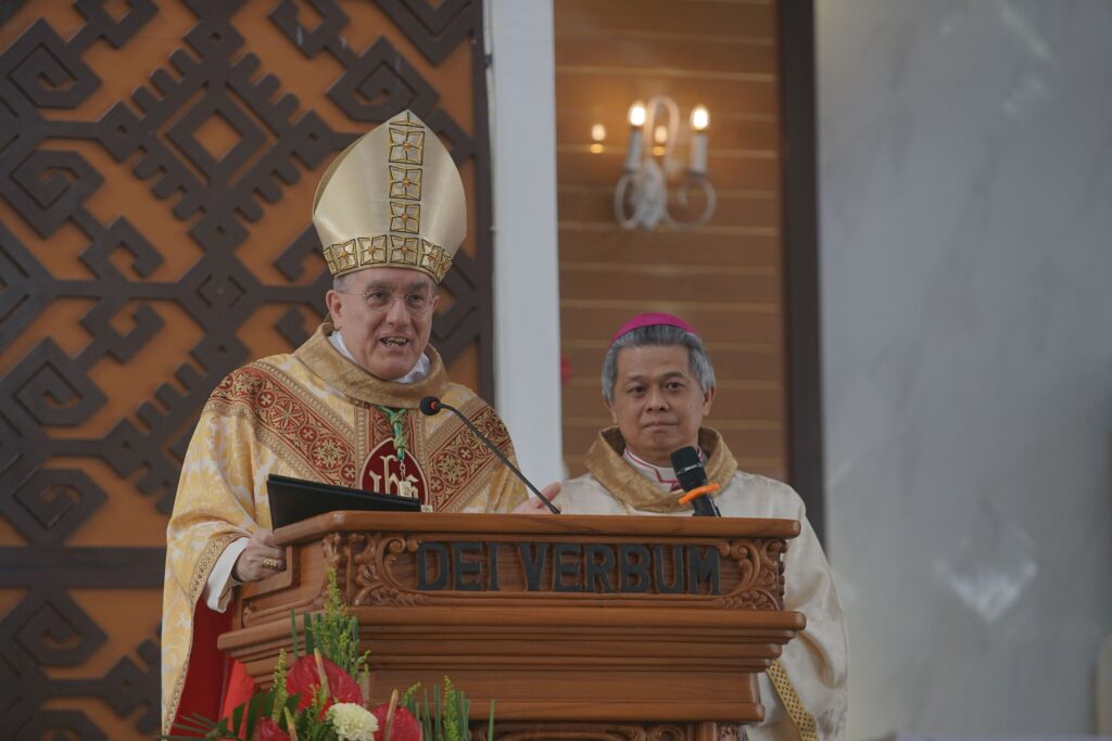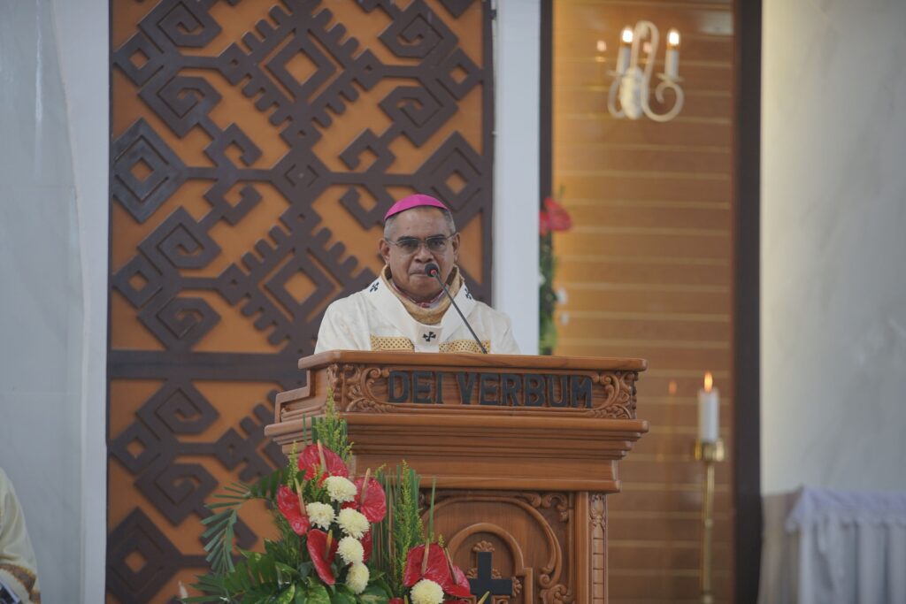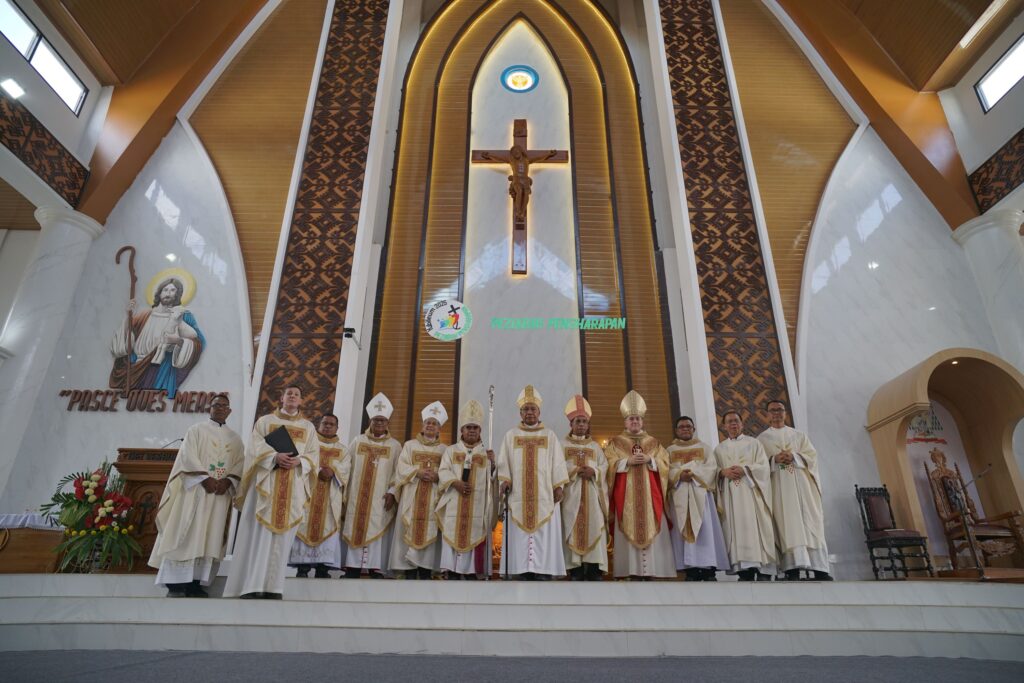 “Pallium ini mengingatkan saya bahwa sebagai gembala, saya harus berjalan bersama kawanan domba, memikul mereka di bahu saya, dan membawa mereka kepada Sang Gembala Agung, Yesus Kristus,” tutur Mgr. Hironimus.